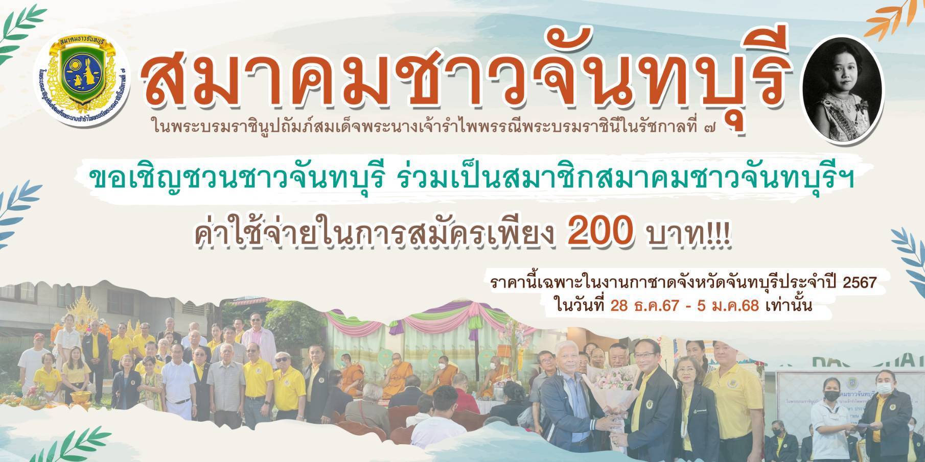 จึงขอเชิญท่านที่มีภูมิลำเนาในจังหวัดจันทบุรี สมัครเป็นสมาชิกสมาคมชาวจันทบุรีฯ ค่าสมัครสามัญสมาชิก (ตลอดชีพ) ท่านละ 200 บาท (ปกติ 500 บาท) ราคานี้เฉพาะงานกาชาดจังหวัดจันทบุรี ประจำปี 2567 เท่านั้น